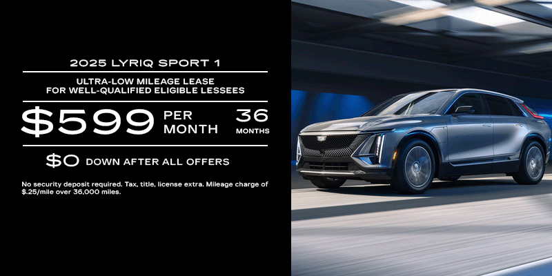 Payments are for a NEW 2025 CADILLAC LYRIQ SPORT 1 with an MSRP of $63,509, based on stock 25685. $0 down after all offers, 36 monthly payments total $21,564. Tax and fees, tag, first month's payment and title not included. Closed-end lease. Must use preferred dealership lender. Option to purchase at lease end for an amount to be determined at lease signing. Must be a current owner of a 2010 model year or newer or a current lessee of a 2019 model year or newer Tesla, Audi, Polestar, Rivian, Genesis, BMW, Mercedes-Benz, Ford, Lincoln, Lexus, or Volvo for at least 30 days prior to the new vehicle sale. Must be a wholesale club member prior to Feb 2nd. Mileage charge of $.25/mile over 36,000 miles. Late payment and early termination fees apply. Lessee is responsible for insuring the lease vehicle. Lessee pays for maintenance, repair, excess wear and disposition fee of $595 or less at end of lease. Not available with some other offers. Residency restrictions apply.
