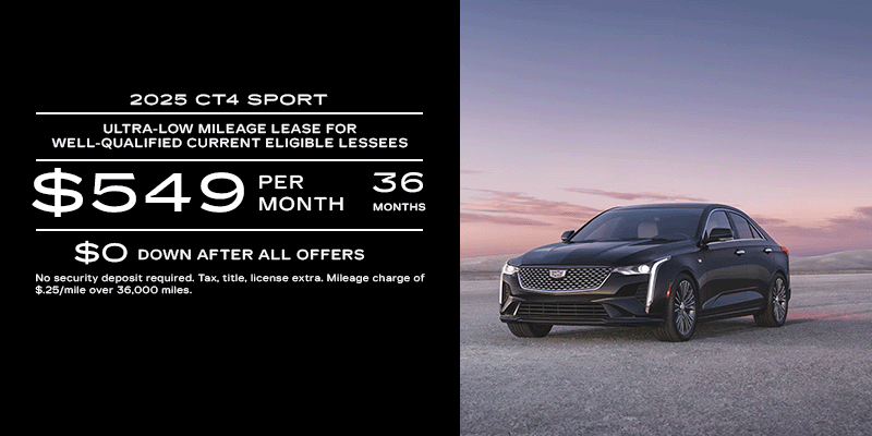 Payments are for a NEW 2025 CADILLAC CT4 SPORT with an MSRP of $48,575, based on stock 25578. $0 down after all offers, 36 monthly payments total $19,764. Tax and fees, tag, first month's payment and title not included. Closed-end lease. Option to purchase at lease end for an amount to be determined at lease signing. Cadillac Financial/GM Financial must approve lease. Mileage charge of $.25/mile over 36,000 miles. Late payment and early termination fees apply. Lessee is responsible for insuring the lease vehicle. Lessee pays for maintenance, repair, excess wear and disposition fee of $595 or less at end of lease. Not available with some other offers. Residency restrictions apply.