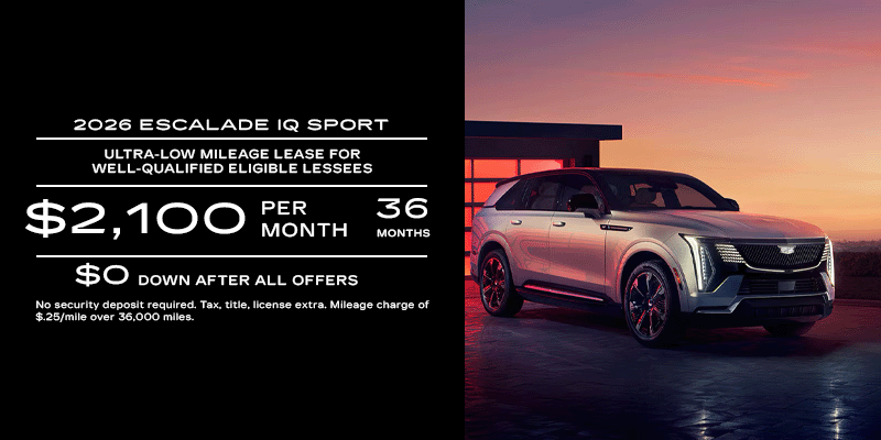 Payments are for a NEW 2026 CADILLAC ESCALADE SPORT with an MSRP of $137,345, based on stock 25576. $0 down after all offers, 36 monthly payments total $75,600. Tax and fees, tag and title and first month's payment not included. Closed-end lease. Must use preferred dealership lender. Option to purchase at lease end for an amount to be determined at lease signing. Mileage charge of $.25/mile over 36,000 miles. Late payment and early termination fees apply. Lessee is responsible for insuring the lease vehicle. Lessee pays for maintenance, repair, excess wear and disposition fee of $595 or less at end of lease. Not available with some other offers. Residency restrictions apply.